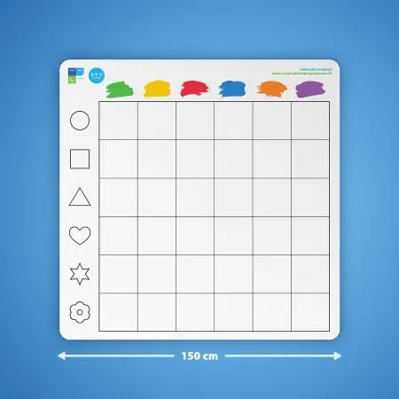 Druga strona to kratownica o 36 polach (każde pole ma wymiary 20x20cm) oznaczona kolorami i kształtami, co daje ogromne możliwości w interakcji z dziećmi. Duże pola o wymiarach 20x20cm pozwalają po nich chodzich i zmieniają podejścio do nauki i zabawy. Jedyne ograniczenie to nasza wyobraźnia.