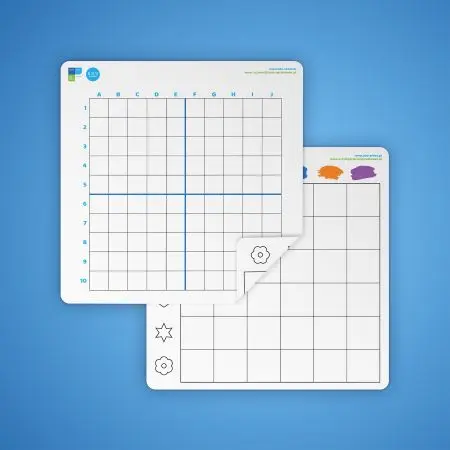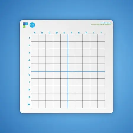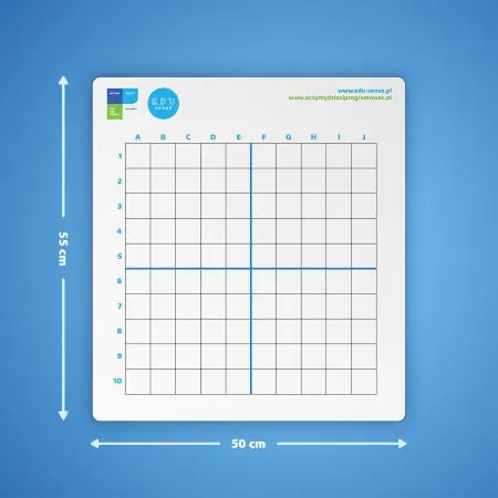 Mata do kodowania w rozmiarze 50x55 cm, to uniwersalne narzędzie edukacyjne, idealne dla przedszkoli i szkół podstawowych. Dwustronna mata z unikalną kratownicą o 100 polach (każde pole ma 4x4cm), została podzielona niebieskimi liniami na symetryczne części. Osie na macie oznaczone są za pomocą cyfr i liter.