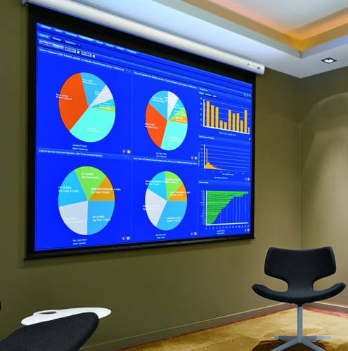 Elektrycznie rozwijany ekran projekcyjny Andromeda z linii PROFESJONALNEJ ze sterowaniem klawiszowym poprzez przełącznik ścienny.