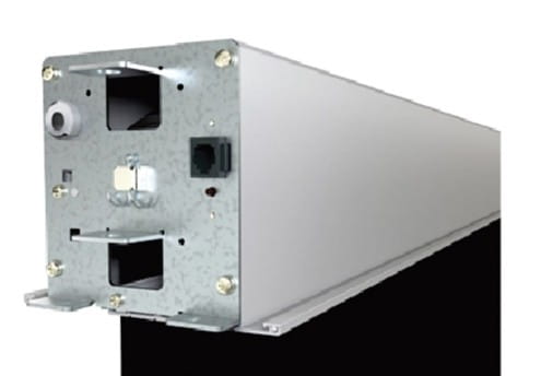 Wbudowane gniazda: Wejście kontrolne RJ11 (6 pin) – dla przełącznika naściennego lub systemu sterowania (RS232/485/Dry Contact). Zasilanie 230V znajduje się z lewej strony kasety ekranu.