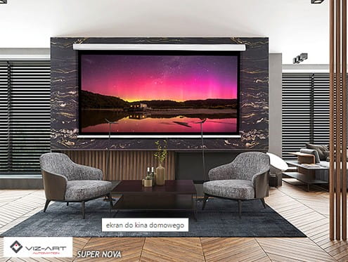 Ekrany projekcyjne linii SUPER NOVA produkowane przez VIZ-ART to profesjonalizm, wygoda i oryginalny wygląd w kinie domowym. Komort użytkowania zapewnia wysokiej jakości trwała powierzchnia, cichy najnowszej generacji napęd Somfy (42dB), szybkie i równomierne zwijanie ekranu w 14 sek. oraz tłumik drgań stosowany od chwili wprowadzenia modelu na rynek AV.