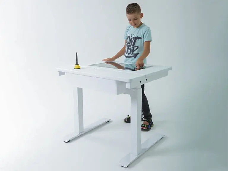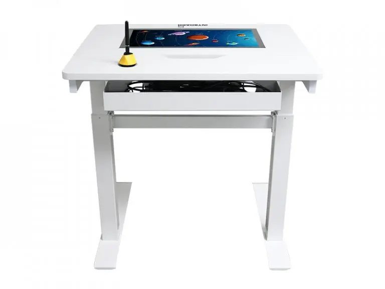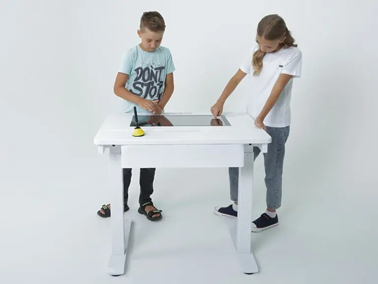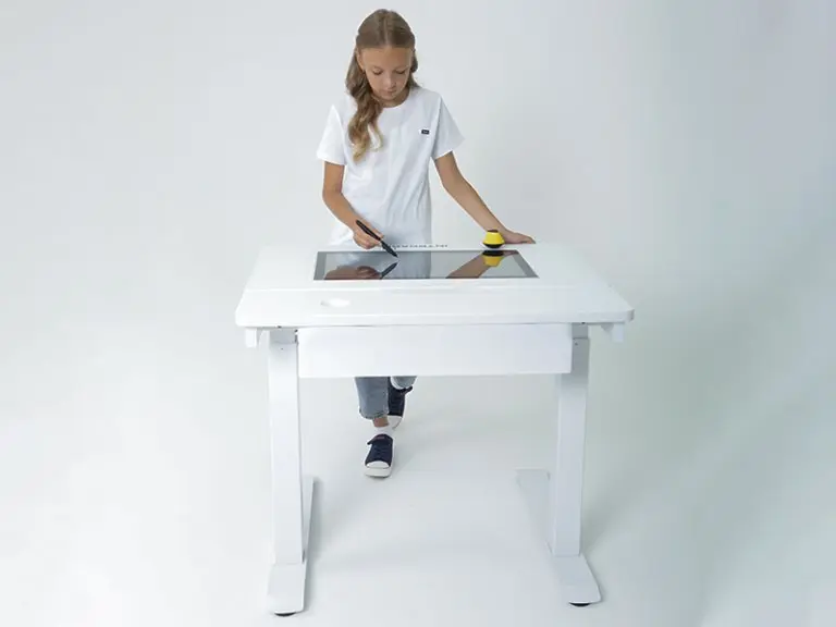 Biurko interaktywne z ekranem dotykowym o kompaktowej i wygodnej konstrukcji, wyposażone w zintegrowany wyświetlacz dotykowy o przekątnej 24 cale. Z powodzeniem może zastąpić biurko szkolne, zarówno w klasie, jak i w domu.