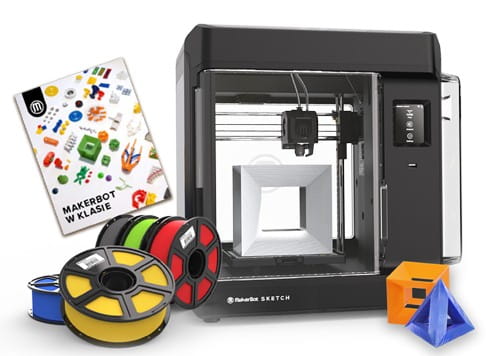 Innowacyjny zestaw do Twojej szkoły. W komplecie otrzymasz: drukarkę 3D MakerBot SKETCH LARGE, biodegradowalny filament PLA – 10 kg, baza modeli 3D, autorski podręcznik i kurs Druk 3D w klasie, platforma e-learningowa SzkoleniaDruk3D.pl, platforma MakerBot Cloud™, integracja platformy projektowej TinkerCAD, szkolenie startowe dla nauczycieli oraz wsparcie techniczne przez okres 5 lat.