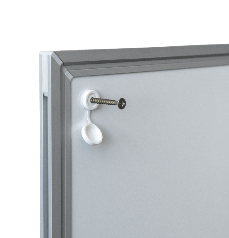 Tablicę można zamontować do ściany poprzez okrągłe zaślepki, które nie tylko maskują śruby, ale róznież podkreślają elegancki i nowoczesny styl.