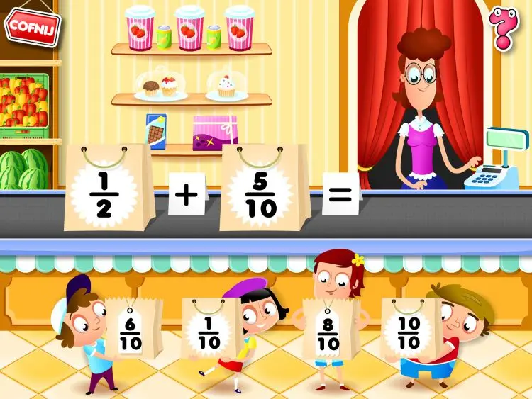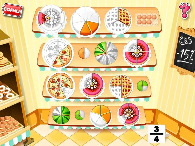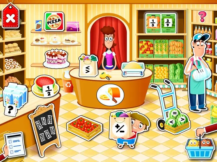 Uczeń znajduje się w sklepie spożywczym, gdzie czekają na niego zadania o różnym ukierunkowaniu, z różnym sposobem ćwiczenia umiejętności: od podstawowego poznawania ułamków (wybieranie obrazków odpowiadających ułamkowi, oznaczanie liczby porcji produktów spożywczych według ułamków czy dobieranie w pary ułamków i obrazków), przez określanie części całości (liczba skrzynek na półkach, liczba kawałków owocu), dalej porównywanie ułamków (przedstawionych liczbowo lub przy pomocy obrazków), przedstawienie ułamków na osi liczbowej (ważenie produktów spożywczych), aż po dodawanie, odejmowanie oraz proste skracanie i rozszerzanie ułamków.