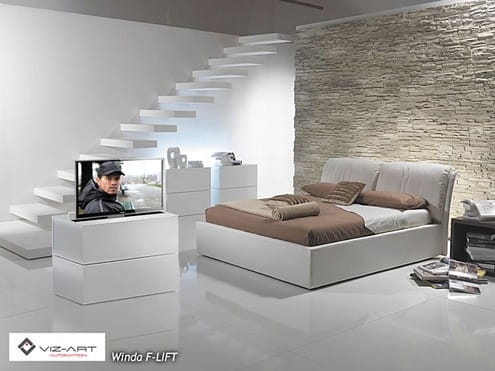 Winda F-lift 46 wysuwa plazmę zainstalowaną w meblu lub zabudowie. Winda F-lift pozwala zachować wybrany styl wnętrza. Plazma montowana do windy F-lift pasuje do dowolnego mebla. F-lift stosowany jest także w stylowych wnętrzach z zabytkowym wyposażeniem, gdzie widoczna plazma nie jest najlepszym rozwiązaniem.