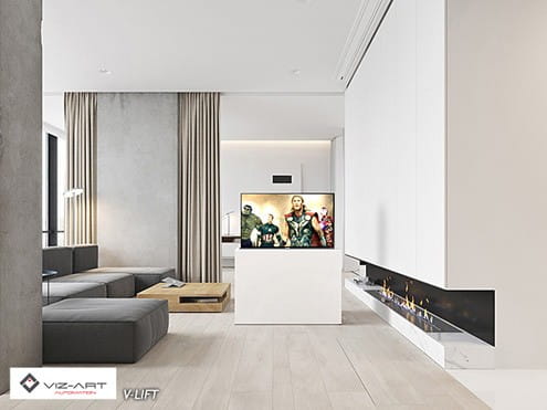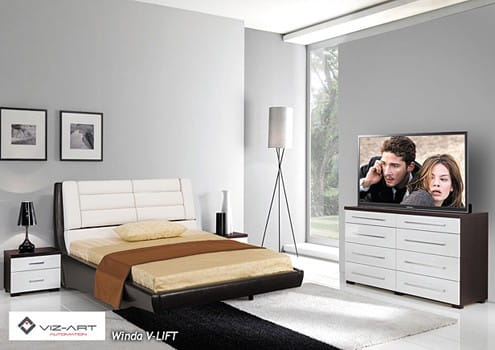 Winda V-Lift umożliwia wysunięcie i chowanie telewizora z mebla, dowolnie w tym celu zaprojektowanego lub wybranego ze stałej oferty producentów mebli.